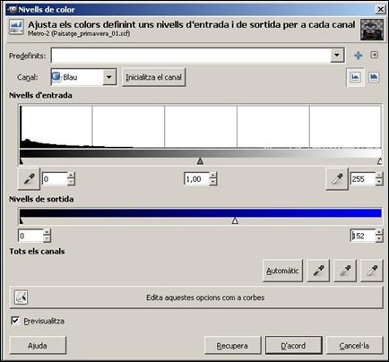 Observem que la lluminositat d’aquesta capa no té res a veure amb la resta de la imatge: és molt blanquinosa. Cal posar una llum més adient. Per fer-ho editarem el nivell de sortida del canal blau, a la finestra de diàleg Color | Nivell de color; ajustem doncs el nivell de sortida a 152.
